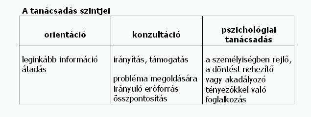 1. az első szinten leginkább információ átadás (orientáció) történik, 2. a második szinten főleg irányítás, támogatás (konzultáció) illetve egy probléma megoldására irányuló erőforrás összpontosítás és személyiség problémák érintése (pszichológiai tanácsadás) történik. Ez az elkülönülés, az említett két első szint között, pályaválasztási területen már jól kikristályosodott: • létezik pályaorientáció, ahol főleg a foglalkozásokra, képzési lehetőségekre és önismertre vonatkozó információk átadása a cél • pályaválasztási tanácsadás, ahol a már beszerzett információk alapján a döntés meghozatalához kínálunk segítséget