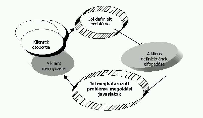Az eladó-vásárló modell A tanácsadói kapcsolat e formájában az a fő kihívás, hogy a tanácsot adó képes-e olyan megoldásokat ajánlani, amelyek "megfelelnek" a tanácsot kérő igényeinek és elfogadhatók a számára. Leküzdendő nehézséget szokott okozni annak belátását elérni a tanácskérőnél, hogy a megoldást a jól körülírt probléma hívta életre s éppen ezért ez a legjobb válasz a feltett kérdésre. Másfajta gondot okoz, ha kiderül, az úgynevezett "jól definiált probléma" jóval összetettebb, vagy egészen más természetű, mint ahogy várták. Ilyenkor új megvilágításba kerül a felek közötti kapcsolat, alapvetően új szerződést kell kötni, esetleg vissza kell utasítani a feladatot.